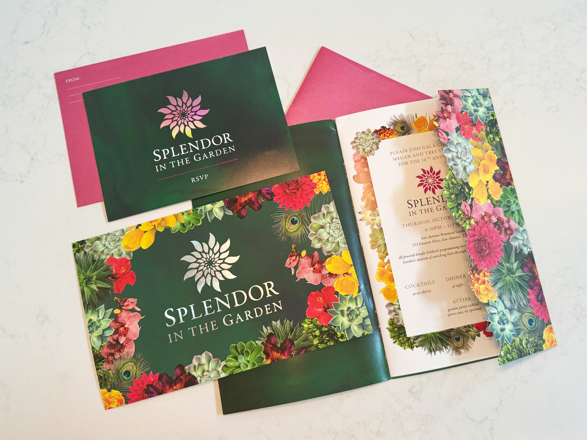 LOGO, INVITATIONS, EVENT DESIGN, AND SOCIAL MEDIA FOR THE SAN ANTONIO BOTANICAL GARDEN GALA, SPLENDOR IN THE GARDEN